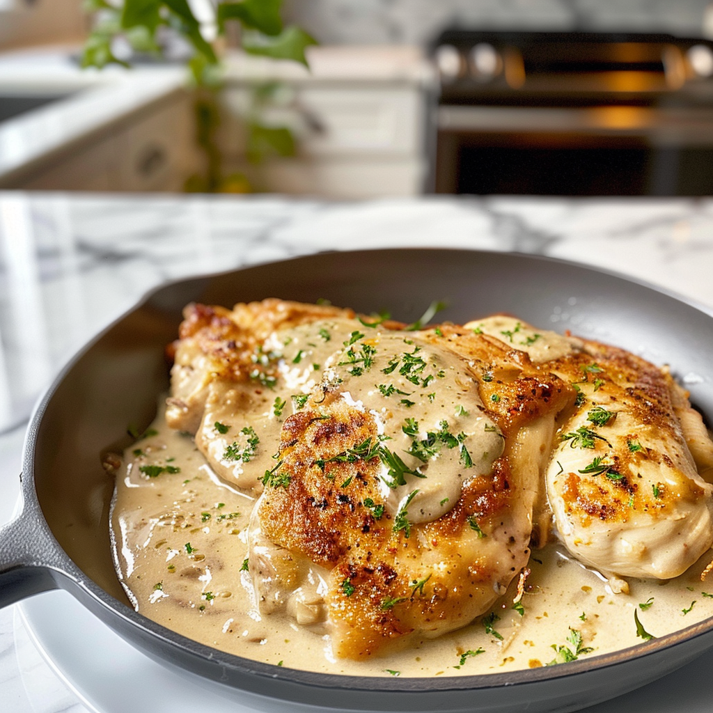 Combine Everything Together: Once the chicken is browned, pour your creamy sauce mixture over it in the skillet. Make sure every piece of chicken gets covered in that luscious goodness.