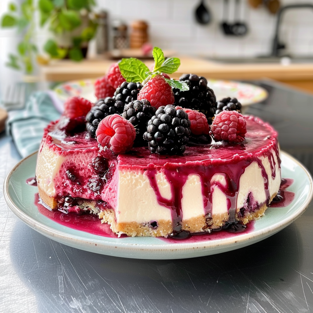 Enjoy each slice as you savor its creamy texture combined with fruity bursts from blackberries and raspberries—the ultimate sweet treat!