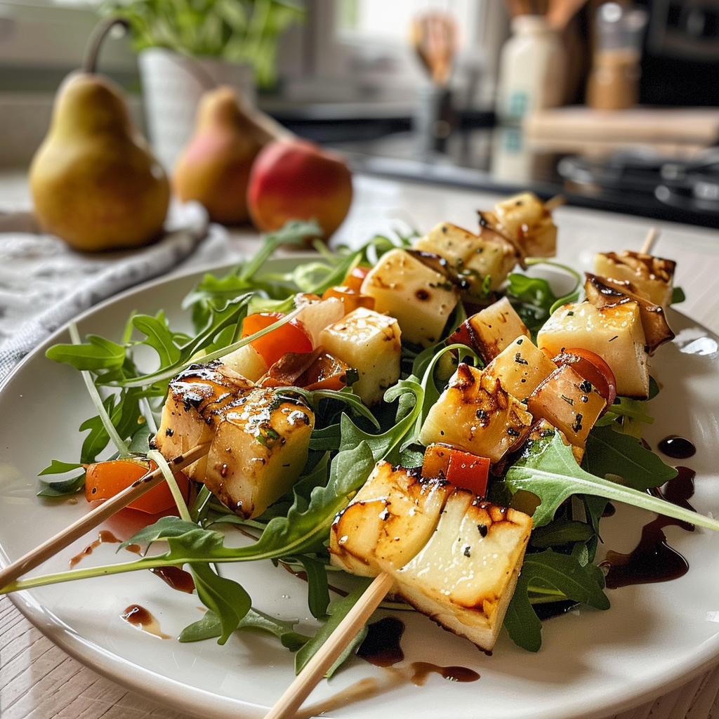 A honey mustard dip or balsamic reduction complements these skewers beautifully.