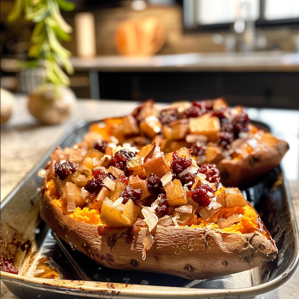 Now it’s time for assembly! Spoon that delicious mash back into each potato shell generously. Top them with the remaining cranberry-apple mixture and sprinkle chopped walnuts or pecans on top for added crunch.