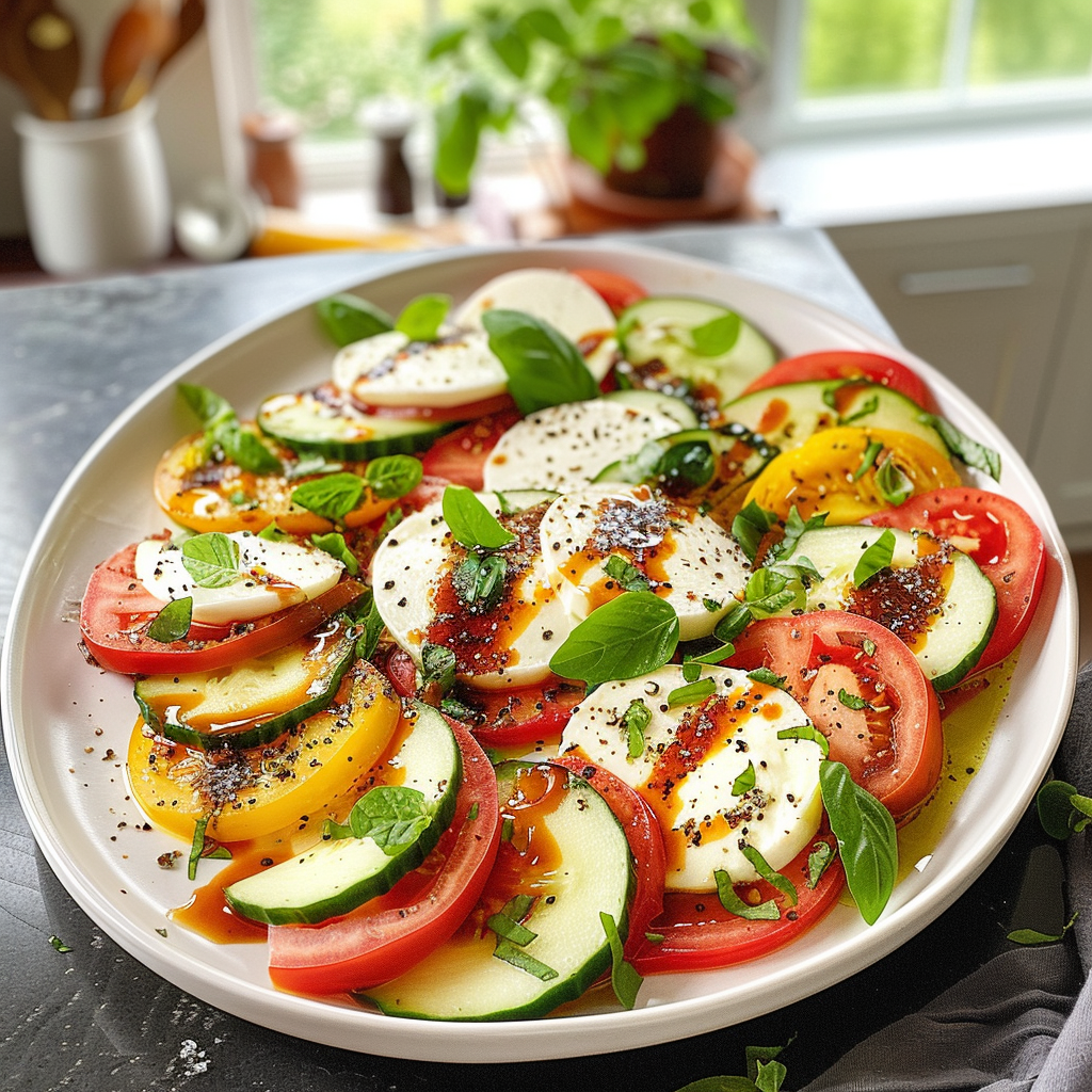 Start by slicing the cucumbers and tomatoes evenly for a beautiful presentation. Next, layer them with mozzarella and basil, drizzling olive oil and balsamic vinegar last to enhance flavor without wilting ingredients.